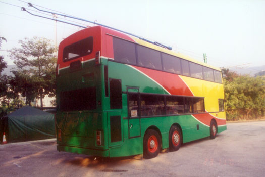 Dennis Dominator 6X2 Dragon 10.4m Photographs (Page 6)The photographs and text below belong to Anthony Lui. You may set it as the wallpaper in your PC. However, you must seek Anthony Lui's permission and state the source before you place any of the pictures on the WWW or show it in public. Self-discipline is expected as I do not put my name in the pictures so as to retain its originality. Citybus TrolleybusThe Transport Department in Hong Kong conducted a series of feasibility studies on the use of trolleybuses in Hong Kong. Citybus Limited carried out a similar study in parallel and in June 2001, they converted 10.4m dragon 701 (GD1492, DDA2202-985) to the world's first air-conditioned double deck trolleybus. A 100m long overhead wiring circuit was set up at their bus park in Wong Chuk Hang as testing track. A Dennis Eagle fire engine withdrawn from the Fire Services Department was converted to a wiring vehicle. Power supply was provided by a diesel generator hired from Ajax Pong, a local construction machinery supplier and a temporary transformer room. The bus was tested from late 2001 to 2003. The government later turned down the idea of trolleybus system owing to the complicated operation environment and lack of routes in favour of the operation. The trolleybus test was put to an end in 2003. The overhead cables were dismantled in 2005 and the bus was scrapped in 2010.