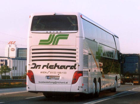 Dr Richard is a large Austrian operator specialised in quality intercity and tour bus service. The S 431 DT above was photographed in Vienna on 24 August 2004. Go to Page 2 Return to Kassbohrer Setra S 431 DT Page created: 23 January 2005 |