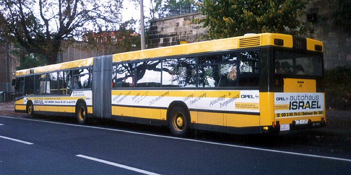 MAN NG 312 PhotographsThe photographs and text below belong to Anthony Lui. You may set it as the wallpaper in your PC. However, you must seek Anthony Lui's permission and state the source before you place any of the pictures on the WWW or show it in public. Self-discipline is expected as I do not put my name in the pictures so as to retain its originality. Dresdener Verkehrsbetriebe NG 312sDVB operates a fleet of 17 NG 312s. 454 116-4 (DD-VB 287, WMAA112052B017626) was photographed in Dresden on 27 August 2004. This NG 312 was photographed in Dresden in September 2002. Photo courtesy: Benton Co. Return to MAN NG 312 Page created: 24 November 2004 |