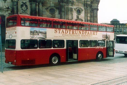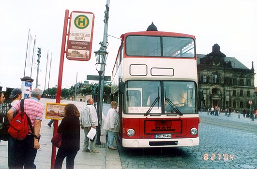 MAN SD200 Photographs (Page 6)The photographs and text below belong to Anthony Lui. You may set it as the wallpaper in your PC. However, you must seek Anthony Lui's permission and state the source before you place any of the pictures on the WWW or show it in public. Self-discipline is expected as I do not put my name in the pictures so as to retain its originality. MAN SD200s in DresdenThe photograph above was taken in Dresden in September 2002. Photo courtesy: Benton Co. The photographs above were taken in Dresden City Centre on 27 August 2004. Go to Page 7 Return to Page 5 Return to MAN SD200 Page created: 22 June 2003 Last updated: 1 May 2005 |